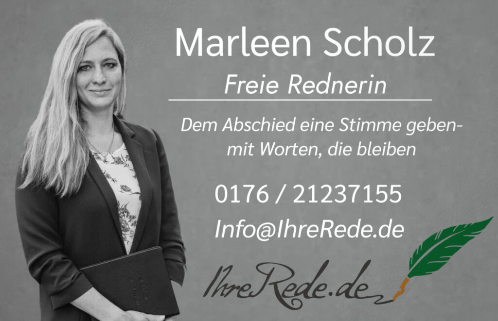 Mein Name ist Marleen Scholz. Ich bin Freie Rednerin in Göttingen und Umgebung. Ich unterstütze und schaffe persönliche Momente auf Ihrer Hochzeit , Trauerfeiern oder Feiern aller Art.